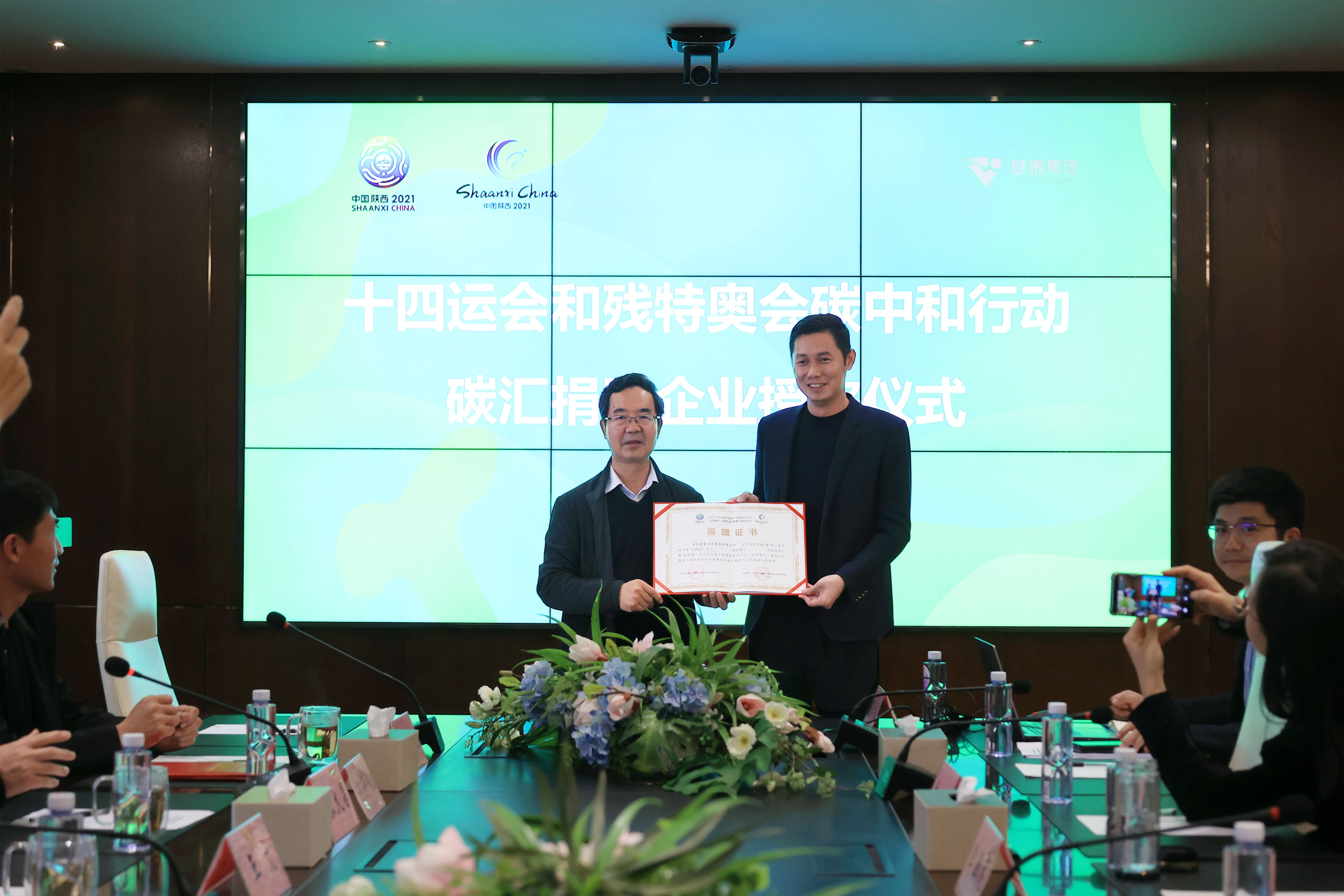 王文為基泰集團(tuán)頒發(fā)“十四運(yùn)會和殘?zhí)貖W會碳中和行動捐贈證書”。